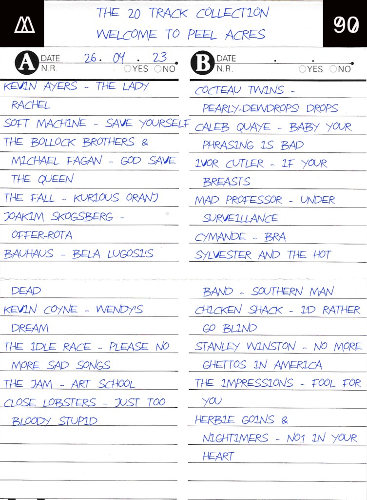 20 tracks chosen by m90 from the BBC6 Music Welcome to Peel Acres series –